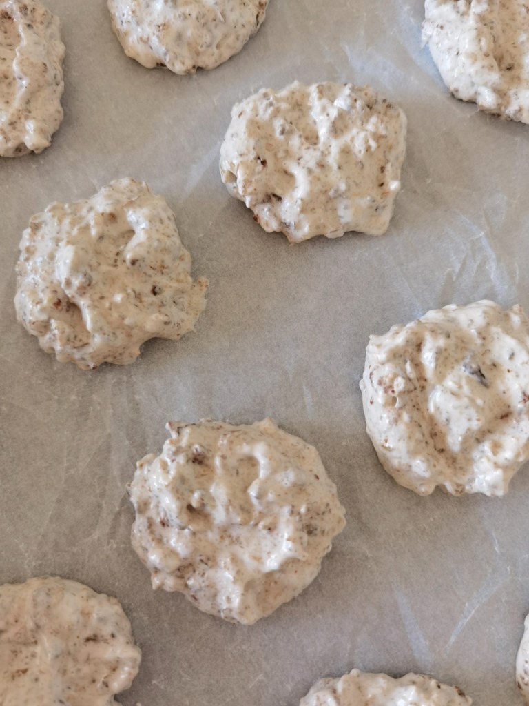 Фурната включих да се загрее на 180 градуса. Тавата на фурната покрих с хартия за печене. С малка лъжичка взимах от сместа и я поставях в тавата, оформяйки сладките, като не е нужно да се спазва голямо разстояние.