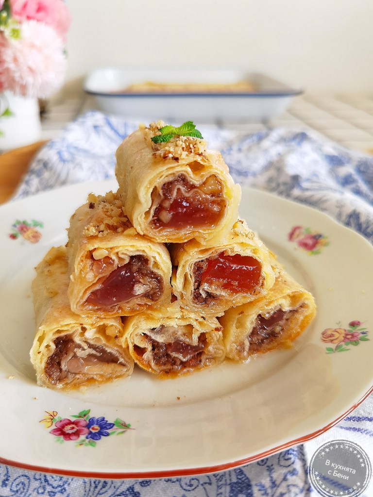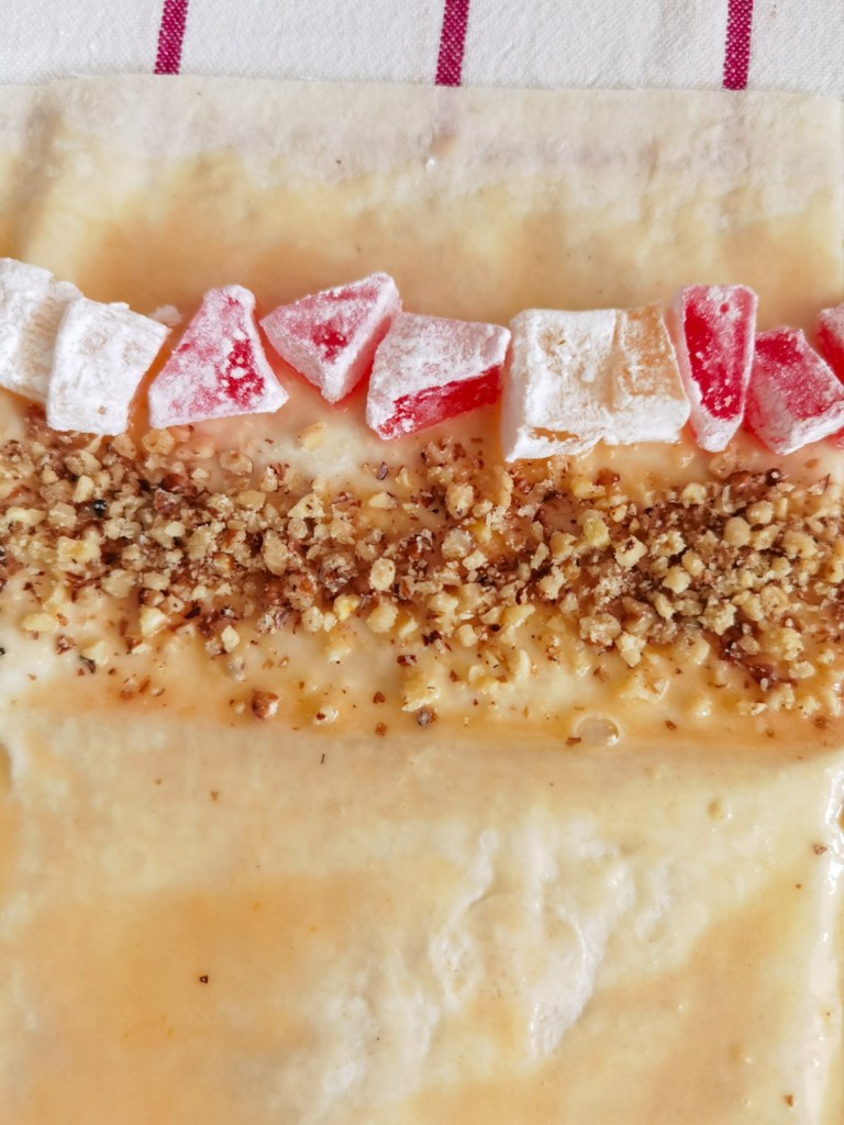 Първата половинка кора намазах изцяло с 1/3-та от сместа, като използвах кухненска четка. В широкия й край плътно разположих парченцата локум, като редувах цветен и обикновен, поръсих с ореховите ядки и завих на руло. Така полученото руло разрязах на две, по-къси, като дължината им съобразих с тази на тавата. Отрязах по малко от краищата, за да се получат с хубава форма и ги поставих в тавата. По този начин приготвих и другите две половинки кори. Важно е рулата в тавата да са плътно подредени едно до друго, за да запазят височината си и да се оформят хубави парченца, след като баницата е готова. Намазах ги добре с разтопеното масло и сложих да се пекат в загрята на 160 градуса фурна, за около 20-ина минути или до лек загар.