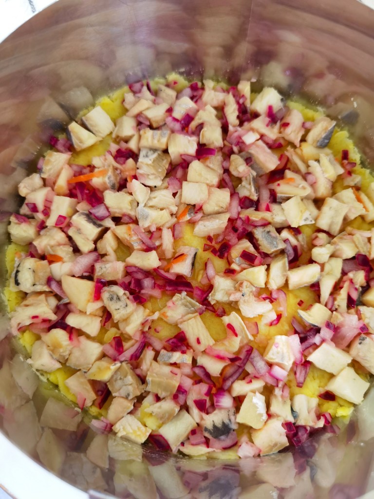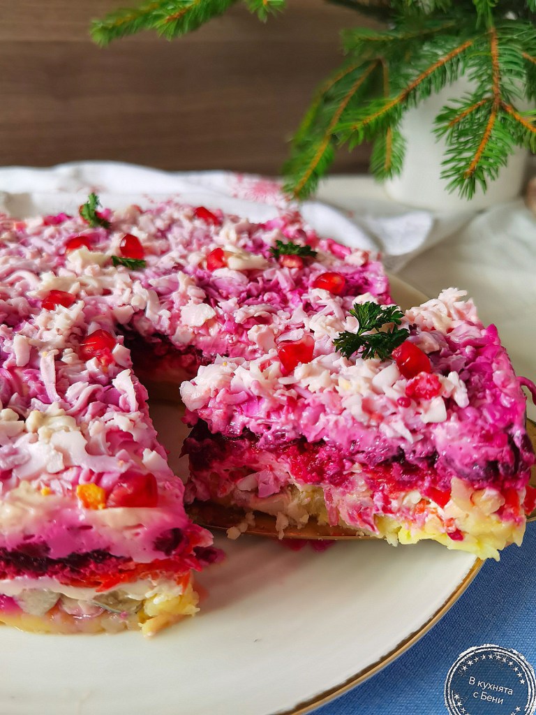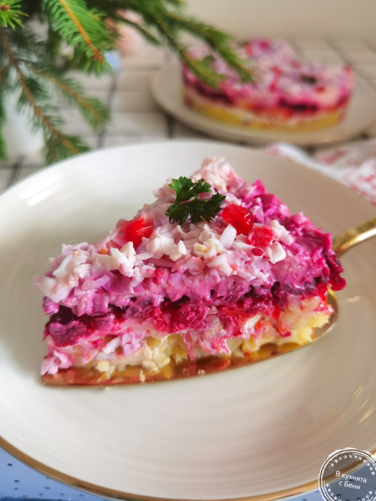 Днес ви представям тази вкусна салата, която наподобява известната „Сельодка под шуба“. Преди време бях пробвала да я направя със сельодка и не ми допадна, поради което този път използвах маринована херинга, с която се получи повече от чудесна. ☺️🍴