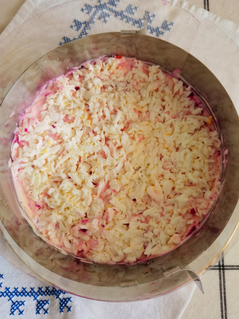 Зеленчуците можете да сварите на пара или във вода. Необелените картофи и морковите сварих в една тенджера, като добавих сол във водата. Цвеклото сварих в друг съд, защото би оцветило зеленчуци. Сварените зеленчуци оставих да изстинат напълно, след което ги настъргах на едро ренде и сложих в отделни малки чинии. Твърдо сварените и охладени яйца обелих, разделих белтъците от жълтъците и ги настъргах.