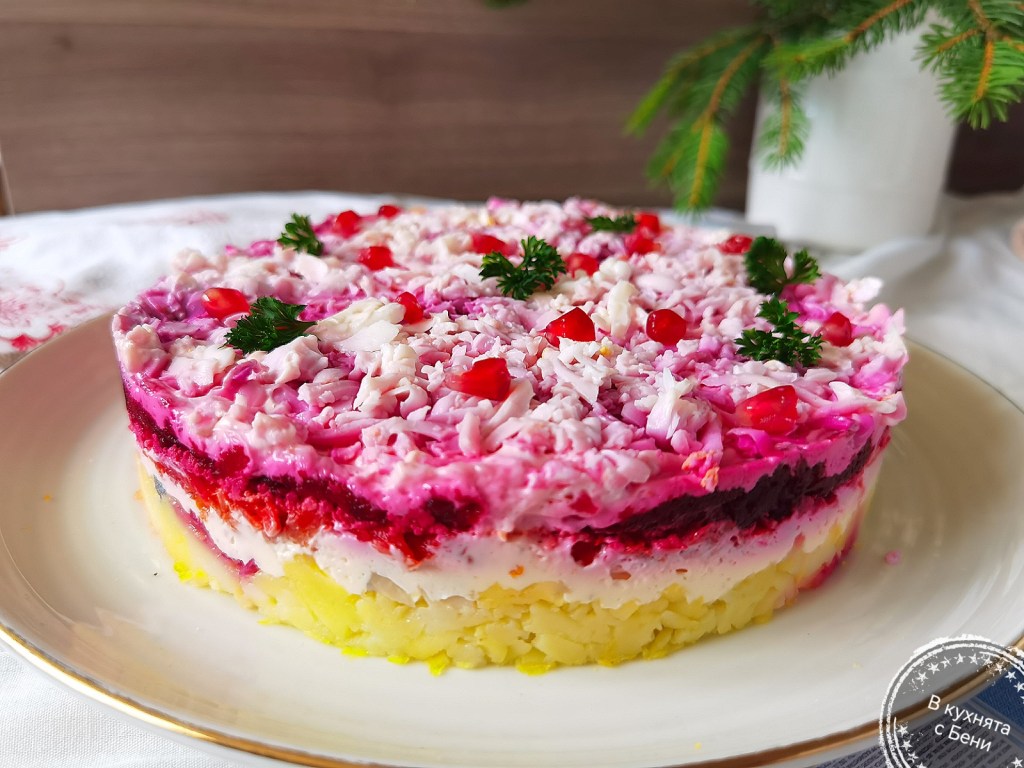 Продължих с пласт от настърганите моркови и жълтъците и нанесох още 1/3-та от майонезата. След това завърших с настърганото цвекло и последната 1/3-та от майонезата. Завърших с настърганите белтъци. Покрих с фолио за свежо съхранение и прибрах салатата за една нощ в хладилника. Преди сервиране я украсих с магданоз и зрънца нар.