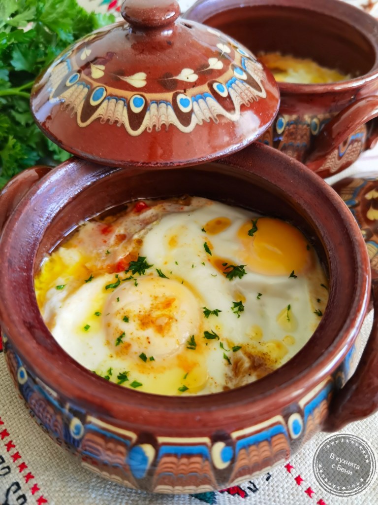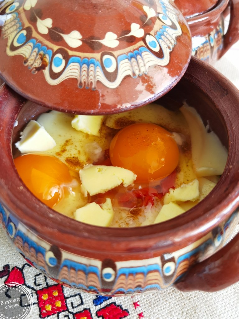 Обелените печени чушки почистих от семената и нарязах на дребно. Доматите от консерва също нарязах на дребно. Дъното и стените на две глинени гювечета намазах с масло. На дъното разпределих доматите. Отгоре сложих натрошеното на дребно сирене. Подредих парченцата чушка и върху тях разположих пласт тънко нарязан кашкавал. Поръсих с шарена сол и добавих по две яйца, които посолих и поръсих с още малко шарена сол. Добавих парченца масло, покрих с капачетата и сложих в леко загрята фурна, която усилих на 190 градуса. Пекох ги, докато яйцата се стегнаха. Сервирах топли, поръсени със ситно нарязан магданоз. Бях изпекла и домашен хляб, който пое от вкусния сос на ястието. Рецептата му е тук https://inthebeniskitchen.com/2025/11/29/%d0%b4%d0%be%d0%bc%d0%b0%d1%88%d0%b5%d0%bd-%d1%85%d0%bb%d1%8f%d0%b1-%d0%b2%d0%b8%d0%b4%d0%b5%d0%be-%d1%80%d0%b5%d1%86%d0%b5%d0%bf%d1%82%d0%b0/