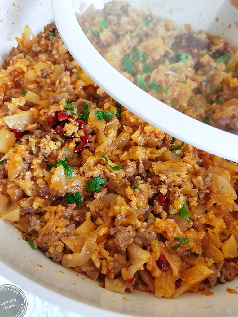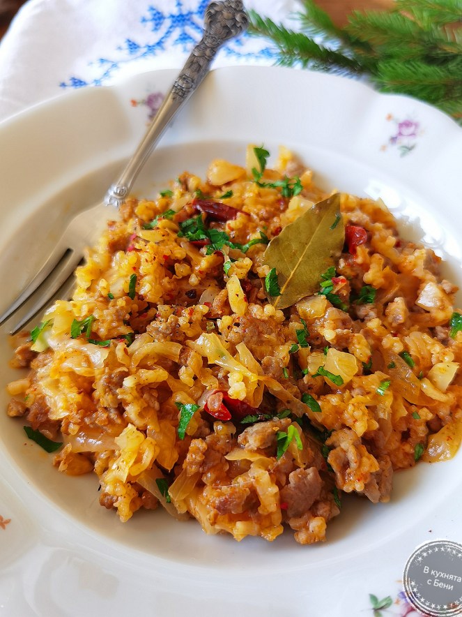 Набързо приготвих това ястие, което като продукти, наподобява сарми, но всичко се готви заедно с нарязаното кисело зеле. Получава се много вкусно и ми е любимо в зимните дни.☺️🍲