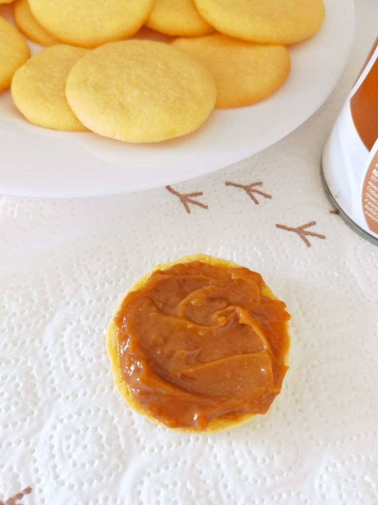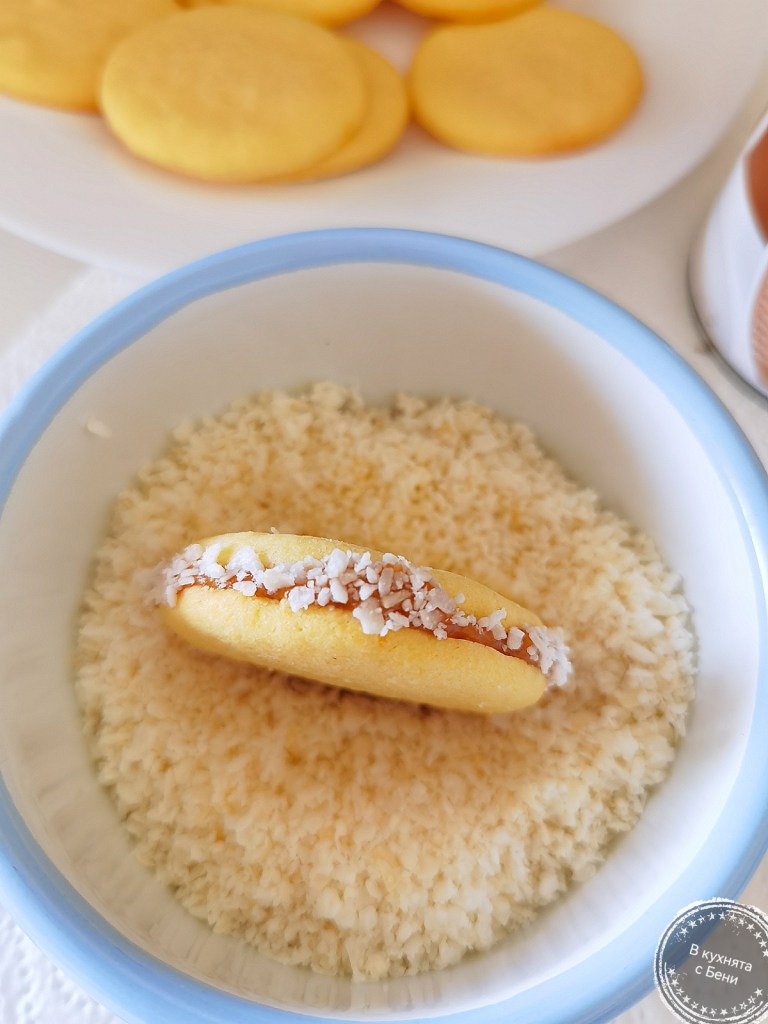 По този начин приготвих и останалото тесто. Изстиналите сладки слепих с карамеленото кондензирано мляко, като леко ги притиснах, за да излезе отстрани малко от пълнежа и по него да полепне смленият кокос, в който ги овалях. Не слагайте много пълнеж, а около 1 ч.л.