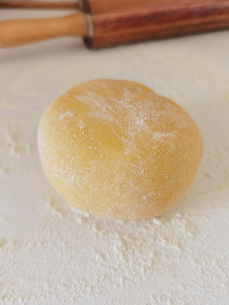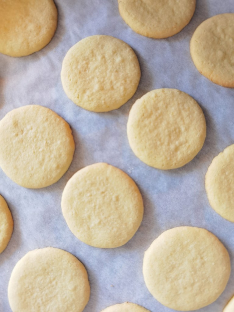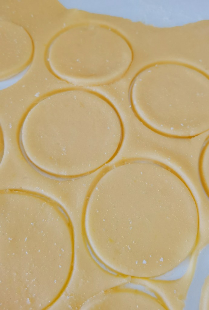 В купа смесих пресятото брашно, нишестето, бакпулвера и содата. В друга купа сложих мекото масло, пудрата захар, ванилията и лимоновата кора и първо ги смесих с помощта на шпатула, а след това ги разбърках с миксер за 2 минути. Един по един добавих жълтъците, като след всеки разбърквах за кратко. Към сместа добавих сухата смес, разбърках и в самата купа омесих за кратко меко тесто. Оформеното на топка тесто увих във фолио за свежо съхранение и прибрах в хладилника за 1 час. След това го разрязах на две половини, за да се работи по-лесно. Едната прибрах в хладилника, а друга разточих върху набрашнен плот и с набрашнена точилка, до дебелината 3 мм. С чаша с диаметър 5,5 см. изрязах формите, които разположих в тава, покрита с хартия за печене. Сложих ги да се пекат з загрята на 180 градуса фурна за 6-7 минути или до съвсем лек загар. Трябва да останат бели. Оставих ги за 2 минути да се охладят в тавата, след което ги преместих върху метална решетка, където да изстинат напълно.