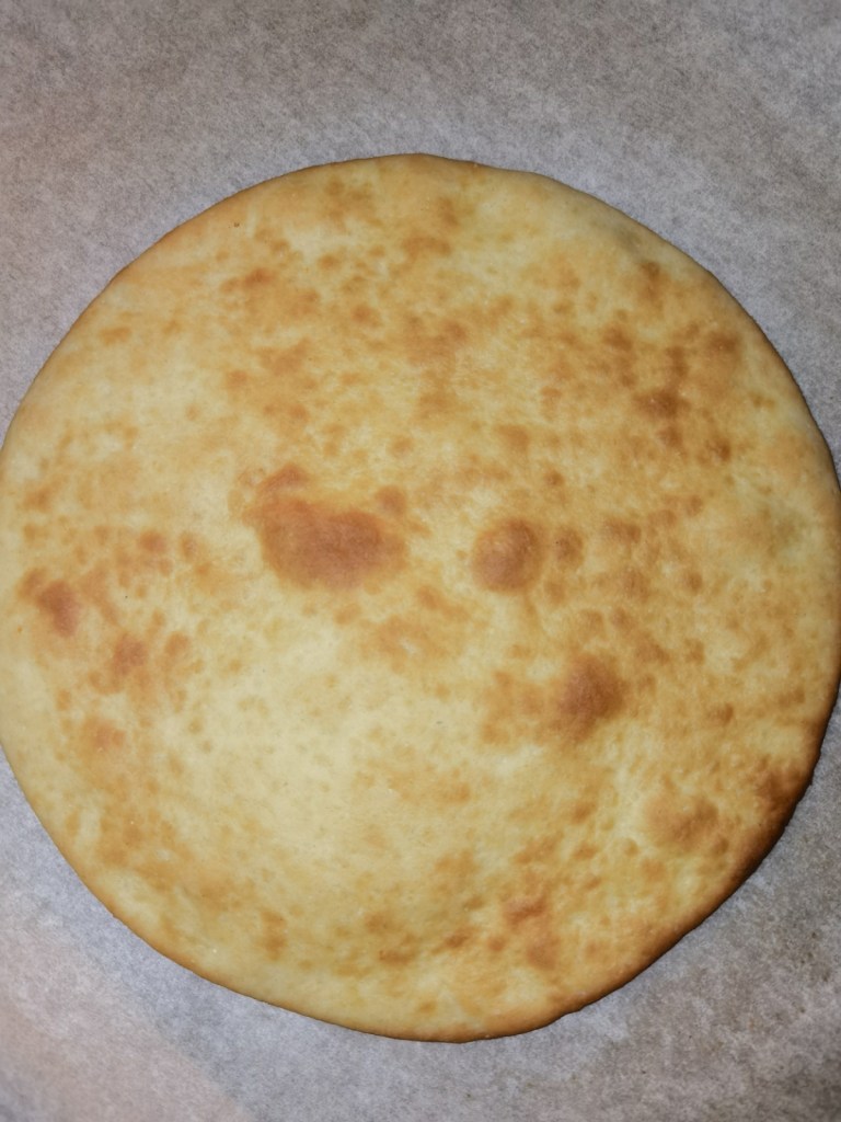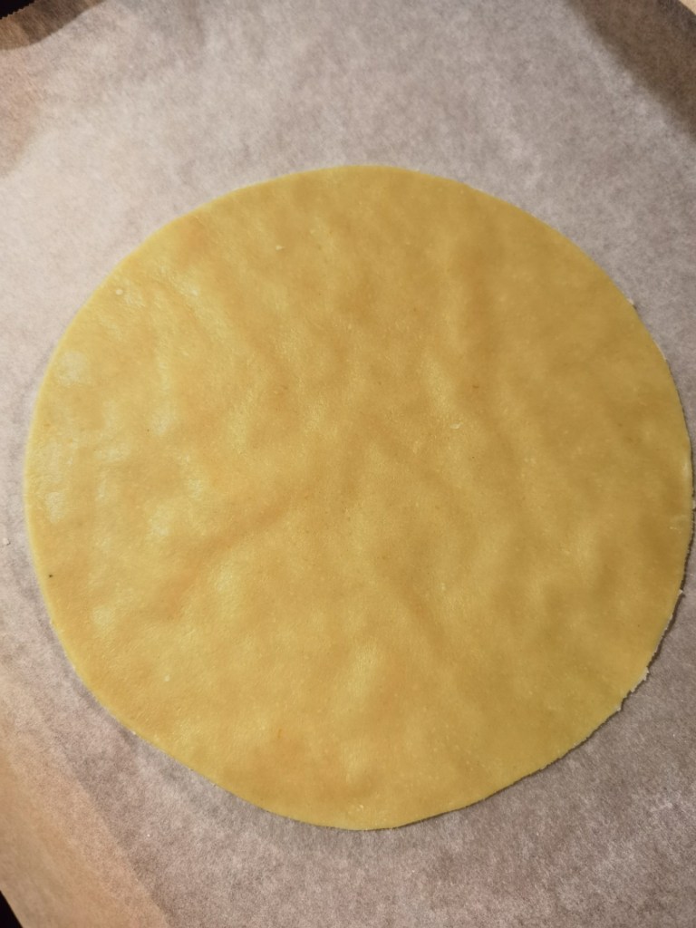 Всяко от топките разточих върху набрашнен плот до тънък блат, който изрязах с помощта на ринг, с диаметър 22 см. Внимателно го прехвърлих върху парче хартия за печене и поставих в тавата на фурната. Прехвърлянето стана като внимателно повдигнах блата с шпатула и подпъхнах хартията под него. Предварително загрях фурната на 180 градуса. В напълно загрятата фурна сложих тавата с блата и рекох около 5-6 минути или до леко златист загар. Не е добре да се препича, но и да не остане суров. ! Щом отворите фурната, ще усетите аромат на амоняк, който бързо се разсейва и след изстиването на блата изчезва напълно. Именно амонячната сода прави блатовете меки.! Изпечения блат прехвърлих заедно с хартията върху метална решетка и продължих с печенето на останалите. Всъщност бях подготвила всички блатове върху парчета хартия за печене и така процесът за готовност бе улеснен.