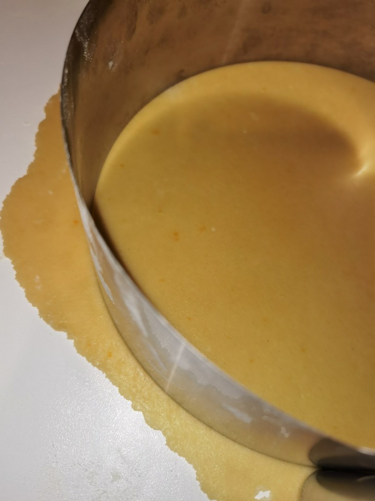 Докато блатовете се охлаждаха, приготвих крема. В средно голяма тенджера изсипах 800 мл. от прясното мляко, добавих захарта и загрях до завиране. Останалите 200 мл. студено прясно мляко сложих в подходящ съд, прибавих брашното и яйцата и с кухненска бъркалка ги разбих енергично до напълно гладка смес. Ако са останали бучици, прецедете сместа. Съда с горещото мляко отстраних от котлона и на тънка струйка при постоянно разбъркване прибавих яйчено-брашнената смес. Върнах на котлона, като намалих степента на котлона на 4 от 6 на моята печка и варих, като не спирах да разбърквам с кухненска бъркалка, до завиране и още 2-3 минути. Към готови крем добавих ванилията, лимоновата кора и маслото и разбърках, докато маслото се разтопи.