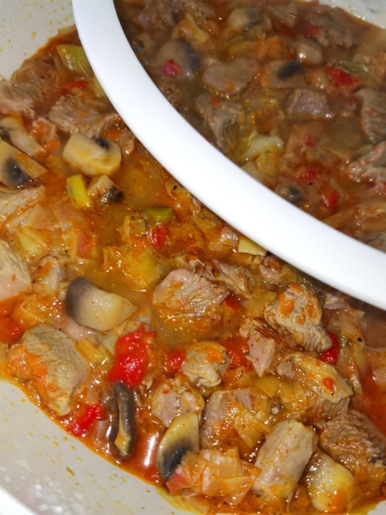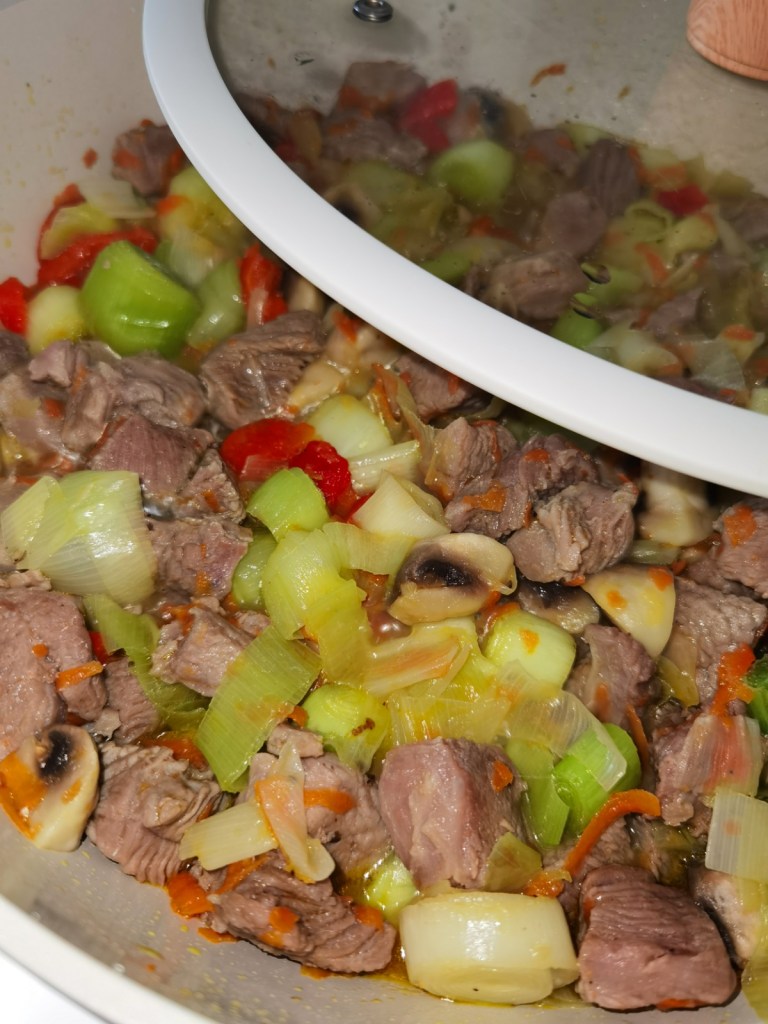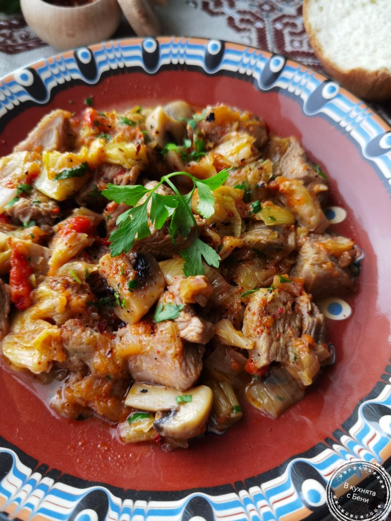 В широк и дълбок съд с керамично покритие и диаметър 28 см. загрях 2 с.л. масло и 2 с.л. олио. Сложих късчетата месо, посолих ги и поръсих с мления пипер меланж. Разбърках и готвих под леко открехнат капак, докато останаха на мазнина. Тогава добавих моркова, готвих 3-4 минути, след което прибавих гъбите, праза и нарязана на тънки ивици чушка, като ги посолих и поръсих с кимиона и подлютката. Готвих под капак, докато поомекнаха, след което полях с 350 мл. вряща вода и готвих на средна степен на котлона до пълна готовност на месото.
