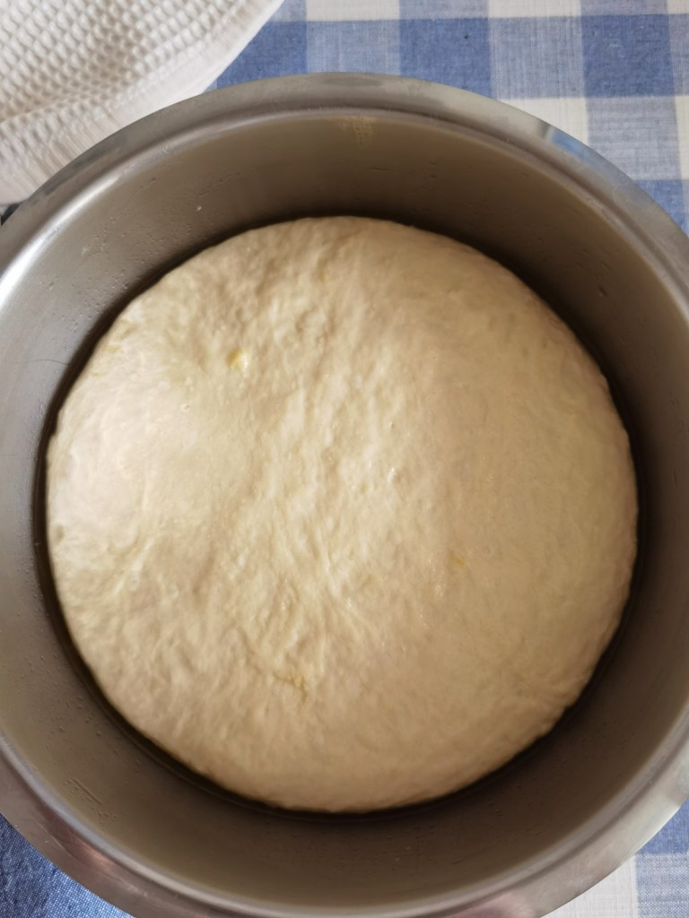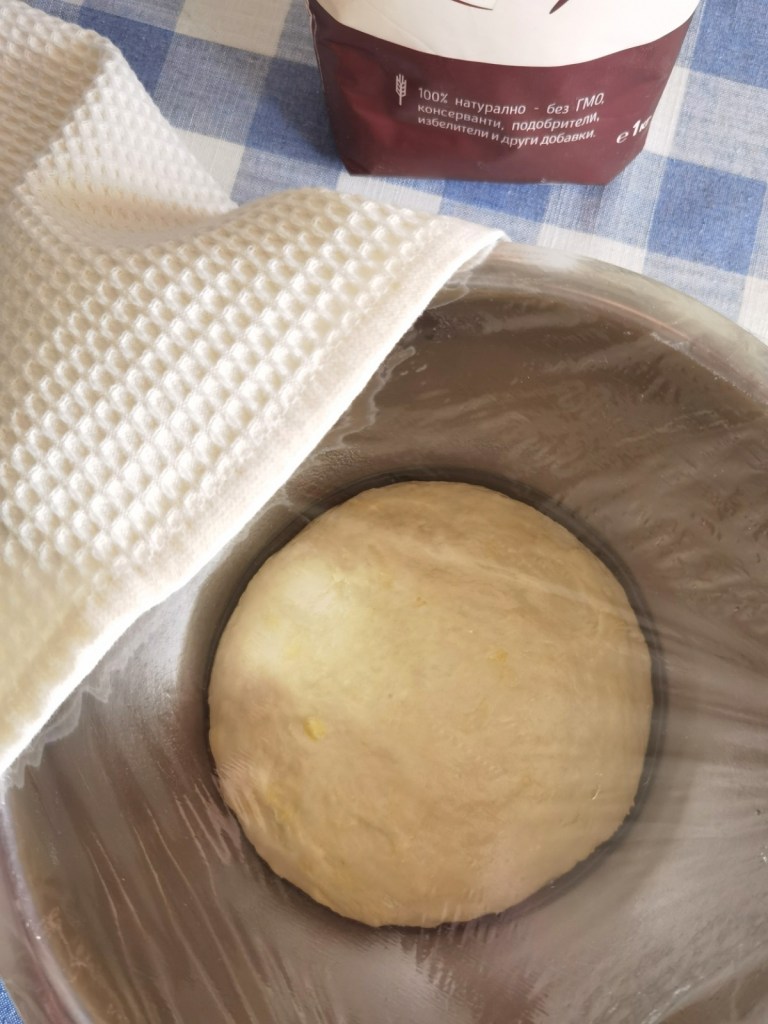 В купата, в която ще замеся тестото сложих сухата мая, брашното, захарта и разбърках. Полях с хладката към топла вода и разбърках до гладка смес. Покрих купата с кърпа и оставих за 15-ина минути да шупне. След това добавих част от пресятото брашно, зехтина и малко от водата и разбърках. Постепенно добавих и останалото брашно, солта и останалата вода. В купата замесих меко тесто, което прехвърлих върху набрашнения плот и доомесих за 3-4 минути, като ми бяха нужни още около 2-3 с.л. брашно, за да не лепне тестото. Не добавяйте твърде много брашно, за да не стане твърдо тестото! Същата купа мазаха с шарлан и поставих тестото, което също намазах с малко от мазнината. Купата покрих с фолио за свежо съхранение и с кърпа и оставих за около 1 час или докато утрои обема си. Паралелно готвех супа и от топлината тестото втаса по-бързо.