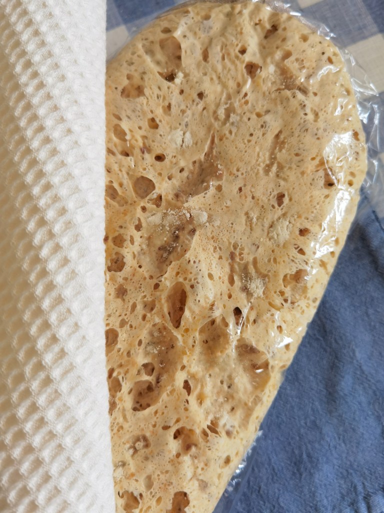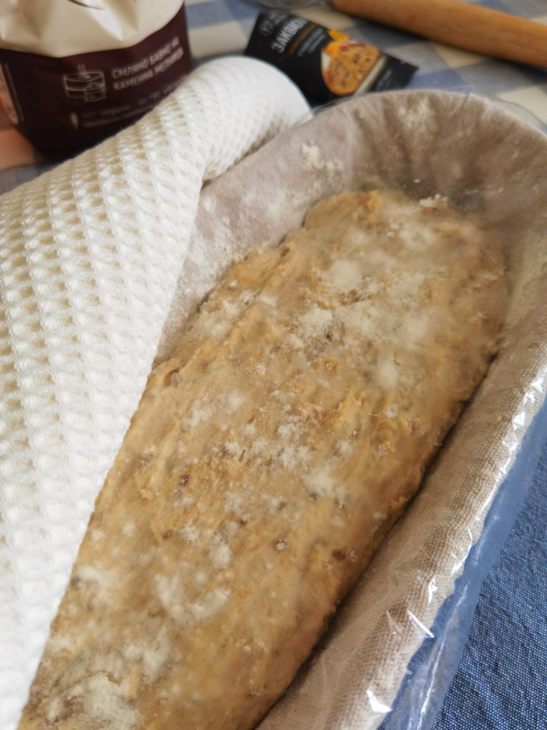 Бялото брашно пресях и сложих в купа. Добавих брашното от лимец и закваската и разбърках. Прибавих солта и отново разбърках. Направих кладенче, в което излях водата и олиото. С бъркалката за тесто разбърках и в самата купа замесих меко тесто, като на два пъти прибавих по още малко брашно, не повече от 1-2 с.л., както и семената. До тук процесът отне около 5 минути. Текстилната част на панера за втасване поръсих с брашно и в него разположих тестото. Поръсих го с малко брашно, покрих с фолио за свежо съхранение и кърпа и го оставих на стайна температура за 3 часа да утрои обема си и на повърхността му да се появят балончета.