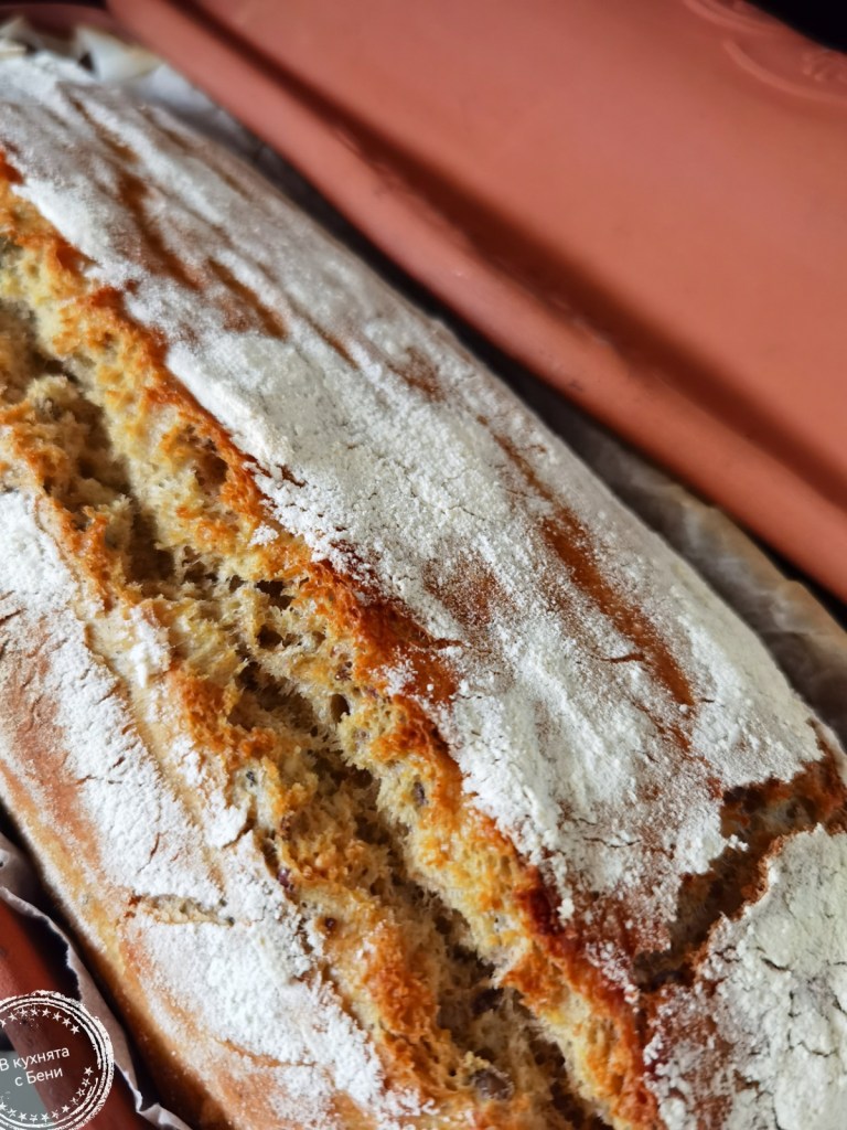 Поставих го в съда, направих един прорез по дължината на хляба, бързо сложих капака и пекох при същата температура точно 30 минути. Изпеченият хляб има апетитен загар, при почукване „бие на кухо“, а и дървено шишче излиза сухо, след като е проболо най-високата част на печивото. Извадих го върху метална решетка, където го оставих да изстине напълно, преди да го разрежа.