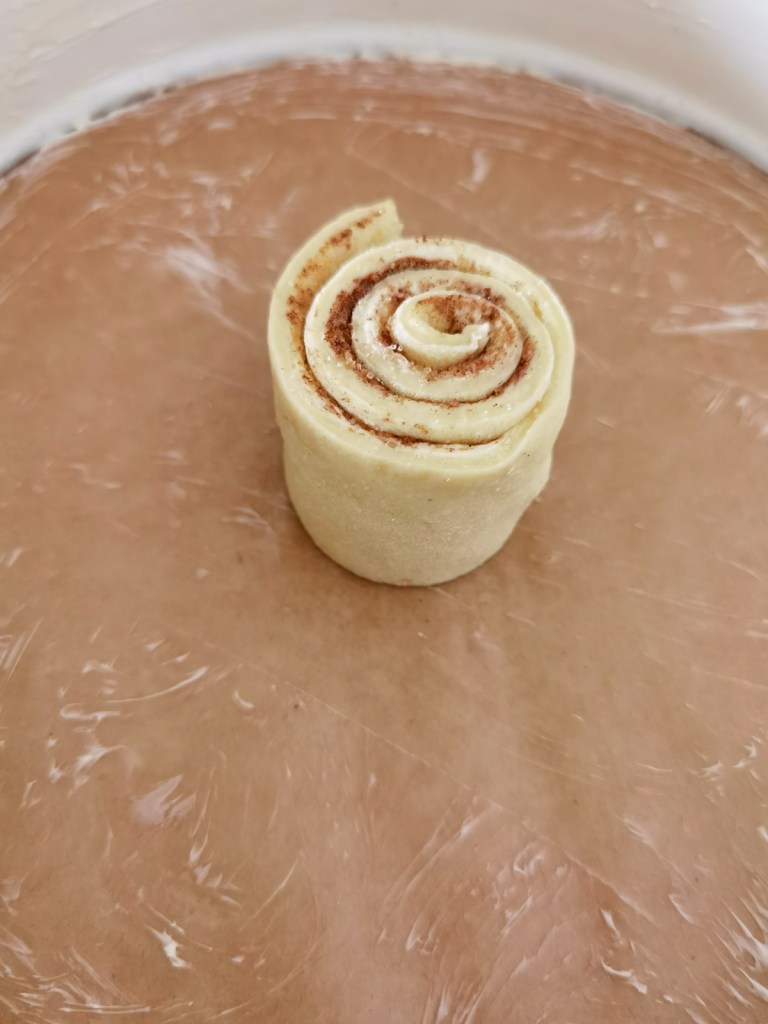 По този начин поставих и останалите ленти, като се получи сладкиш с диаметър 16 см. Покрих формата с фолио за свежо съхранение и оставих сладкиша да втаса за 2 часа.