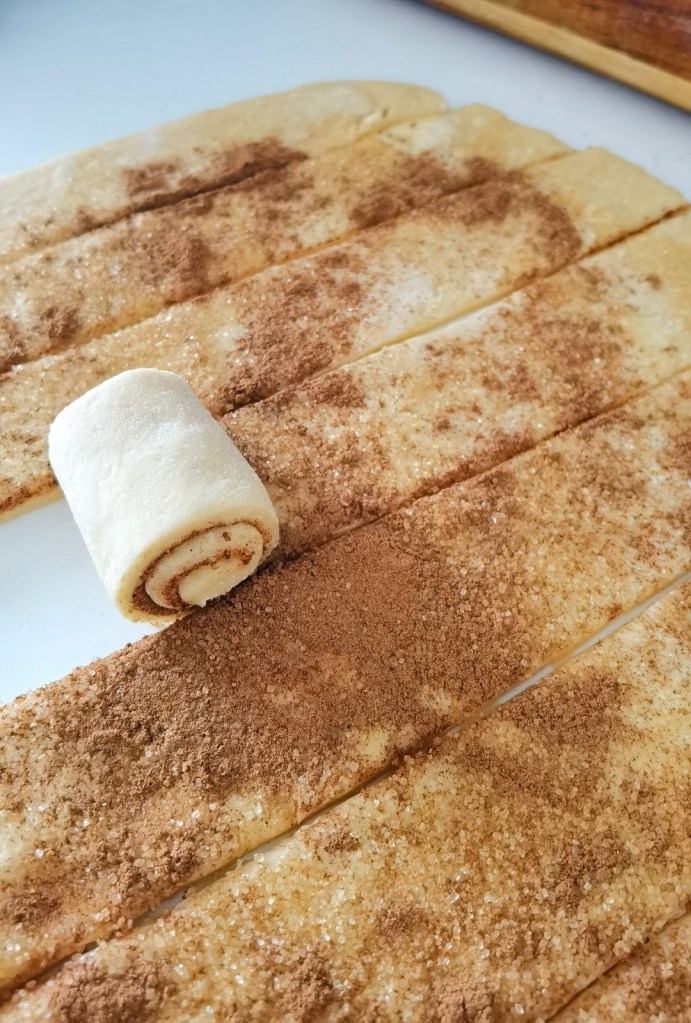 След това време разточих тестото на блат с дебелина 0,5 см. и приблизителни размери 40х30 см. Намазах повърхността с мекото масло, поръсих равномерно с кафявата захар и канелата, като съвсем леко ги притиснах. Разрязах тестото на ленти с широчина 4 см.