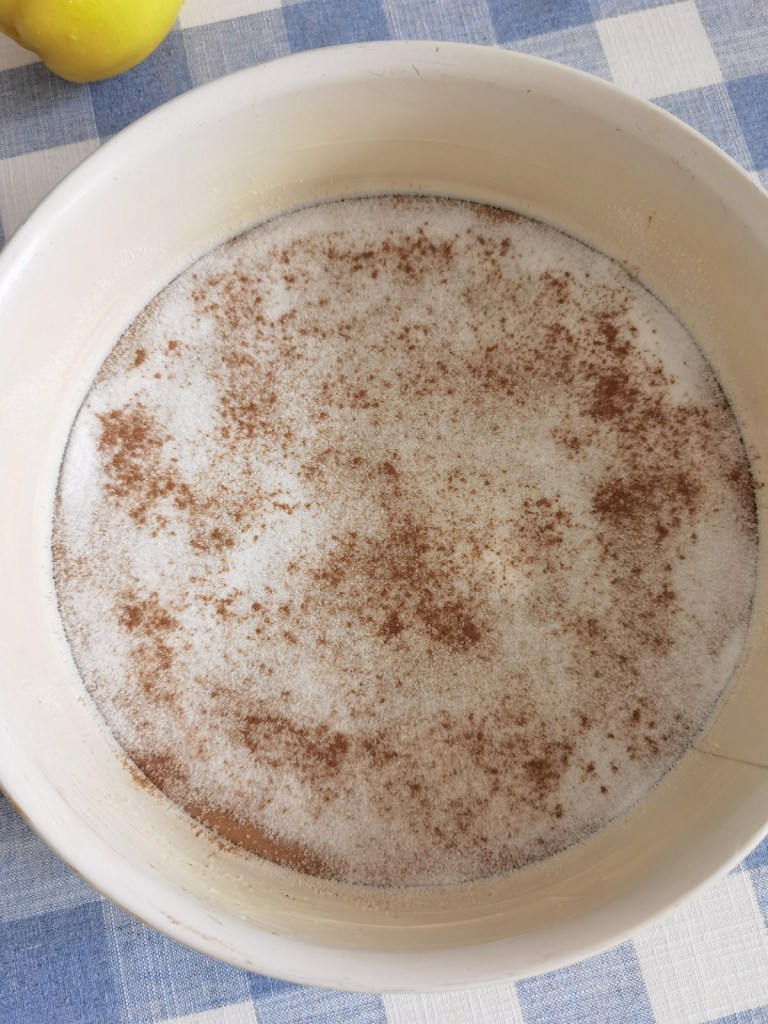 Фурната загрях на 170 градуса. Дъното на форма с махащ се ринг и диаметър 27 см. покрих с хартия за печене, сложих и стегнах ринга и изрязах излишната хартия, която остана отвън. Стените на ринга намазах с масло, а върху хартията на дъното поръсих със захарта и канелата. Моята форма има дъно с улей, но ако вашата няма, сложете някаква широка тавичка под нея, в случай че потече карамел или тесто.