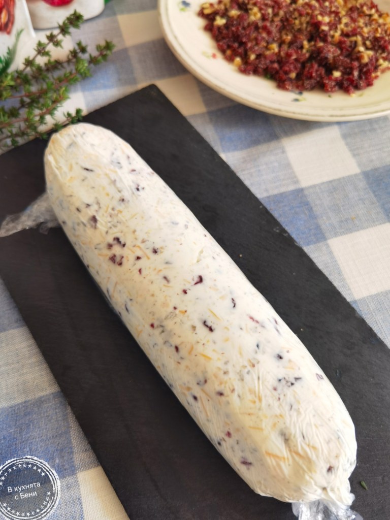 Върху парче хартия за печене изсипах останалата смес от купичката, развих „саламчето“ и го овалях добре от всички страни. Сложих го върху парче хартия за печене и сервирах върху дъска с крекери.