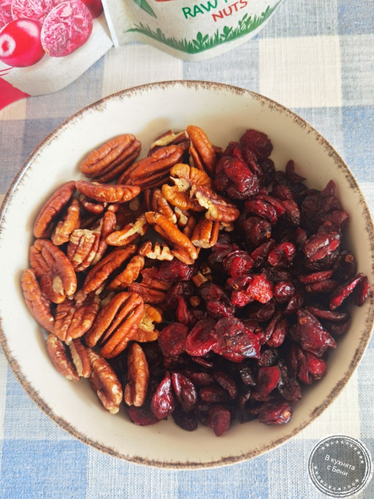 Пекан ядките нарязах на дребно с помощта на кухненския робот. Ако не разполагате с такъв, ги накълцайте на дребно с нож. Не трябва да са смлени, а ситно нарязани. Сушените червени боровнки нарязах на дребно. Те са меки и много вкусни. Взех листчетата от клонките мащерка и заедно с пеканите и боровинките ги смесих в малка купа.