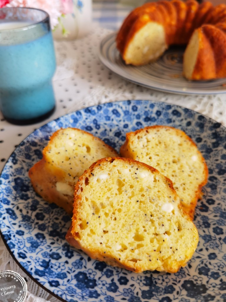 Кексът оставих за 10 минута във фурната при отворена врата, а след това го обърнах върху метална решетка, за да изстине леко. След това го преместих в чинията за сервиране и го разрязах топъл, но не горещ и сервирах с айрян.