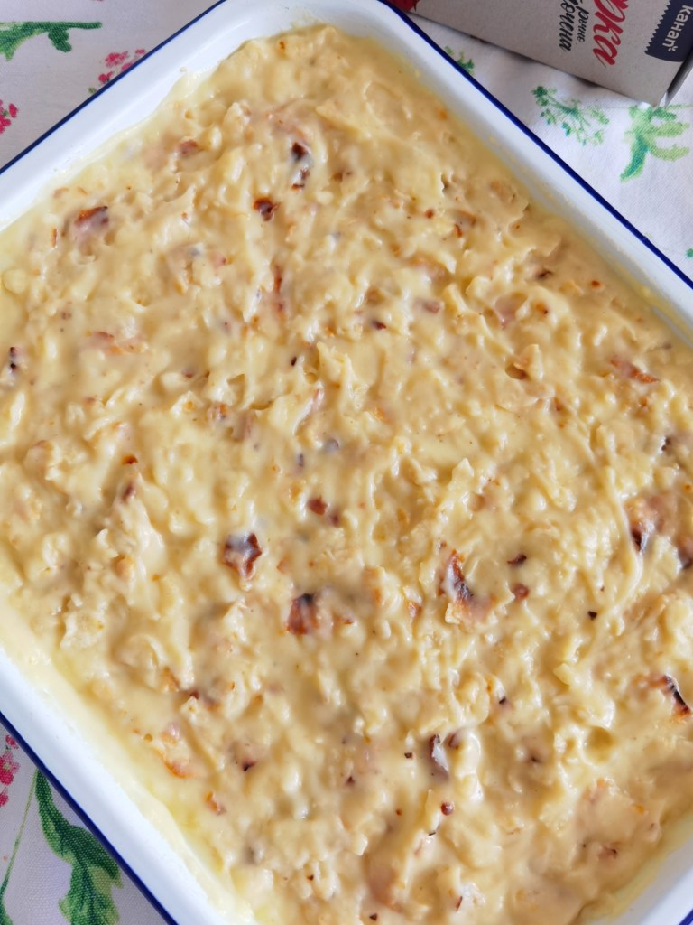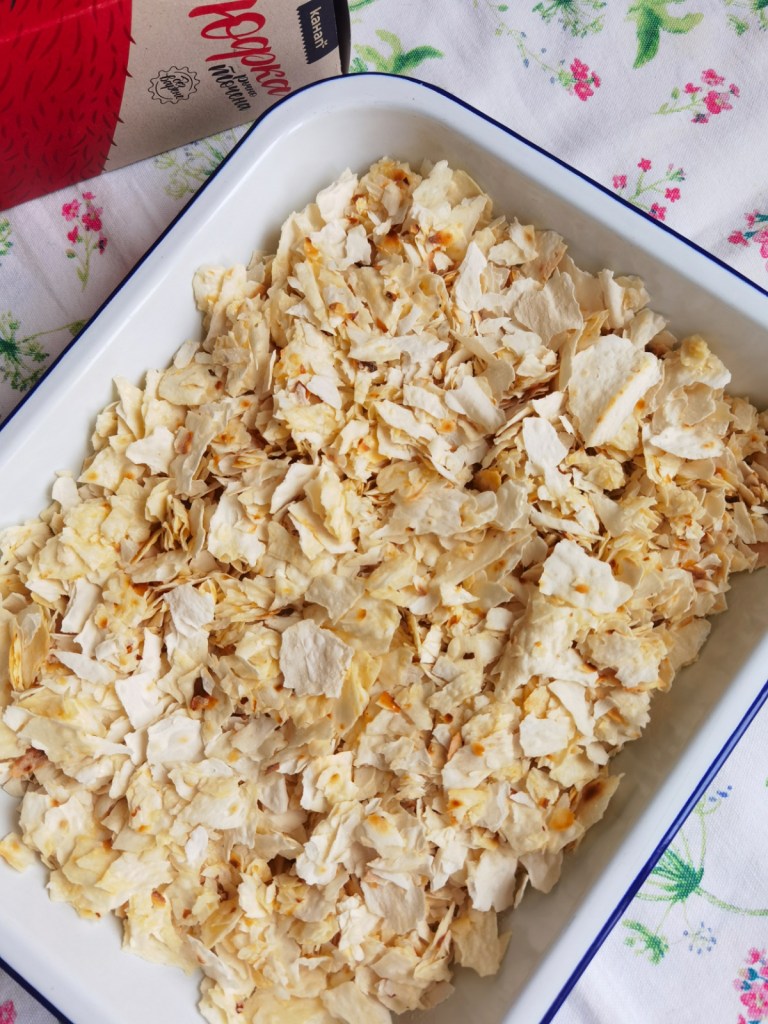 Юфката изсипах в тава с размер 29х22х5 см. и полях с разтопеното масло. Разбърках и сложих в загрята на 180 градуса фурна за 7-8 минути или до леко запичане. Наблюдавайте процеса, защото може лесно да прегори. Оставих я да се охлади, докато приготвя крема.