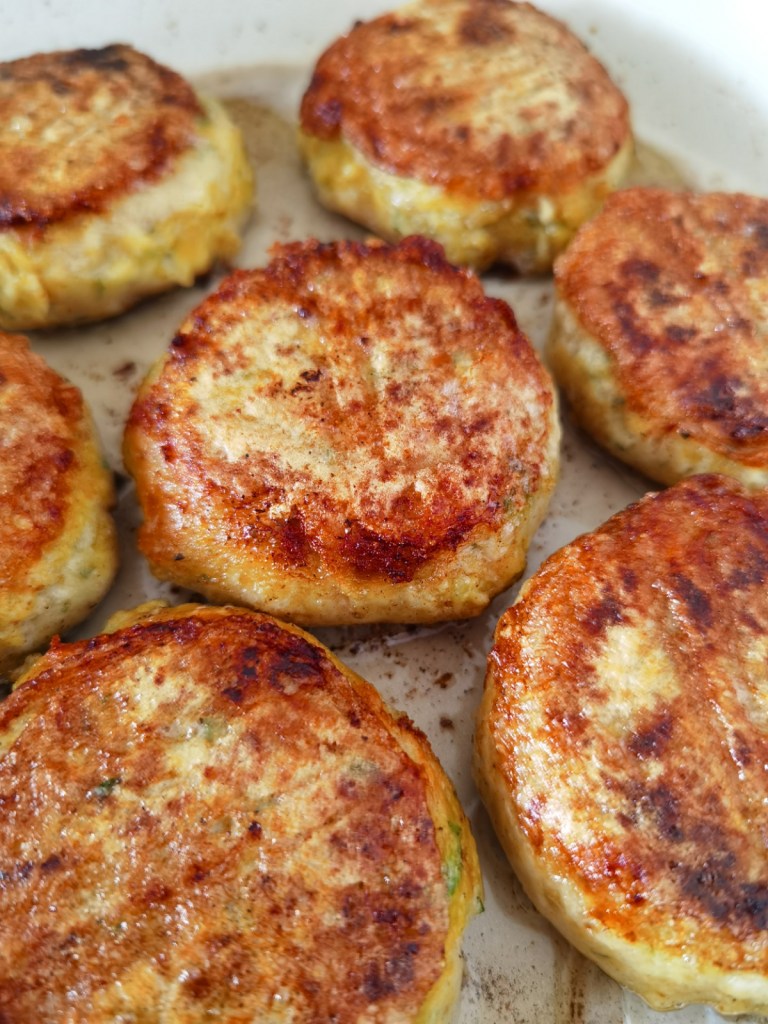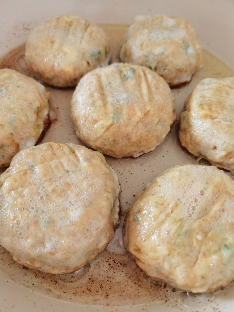 Когато всички бяха готови, в малка купичка разбърках белтъците с щипка сол. В тиган с керамично покритие сложих олио, което леко покри дъното и добавих малко парченце масло. Котлона загрях на 4 от 6 степени на моята печка. С помощта на малка шпатула внимателно взимах кюфтетата и ги овалвах в белтъците, след което ги слагах да се пържат. На два пъти изпържих цялото количество. Щом бъдат сложени в тигана, кюфтетата не трябва да се докосват или побутват! Когато видимо добиха загар от долу, с ловко движение ги обръщах и пържих и от другата страна. Повторих това още веднъж, тоест обърнах ги общо по два пъти на страна.