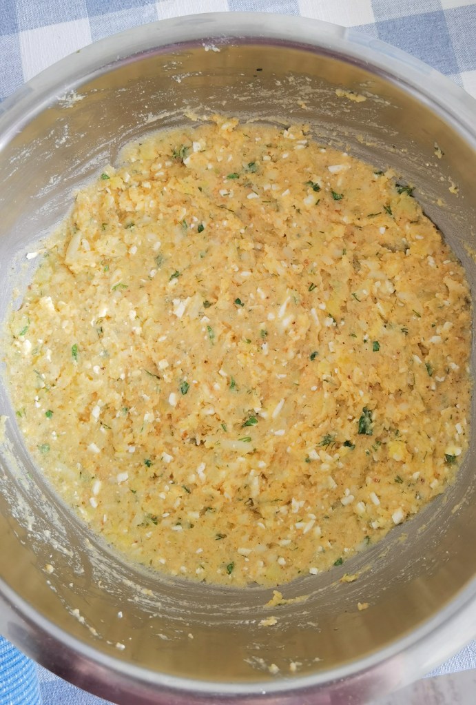 Картофите измих добре и сварих в подсолена вода до пълно омесване. Отцедих ги оставих леко да изстинат, след което ги обелих и намачках с уреда с дупки за целта. Добавих сол на вкус и разбърках. Добавих млякото, олиото, леко разбърканите жълтъци, галетата, подправките, сиренето, кашкавала, магданоза и копъра. Разбърках много добре сместа и я оставих да си почине за 30-40 минути, без да я покривам.