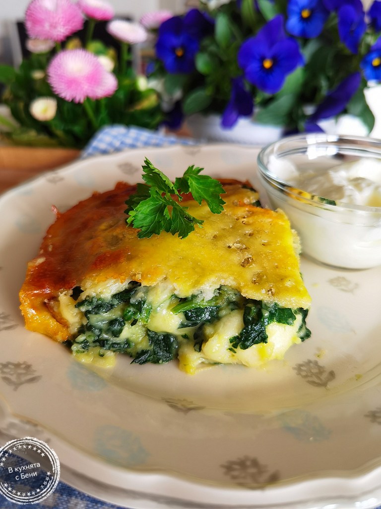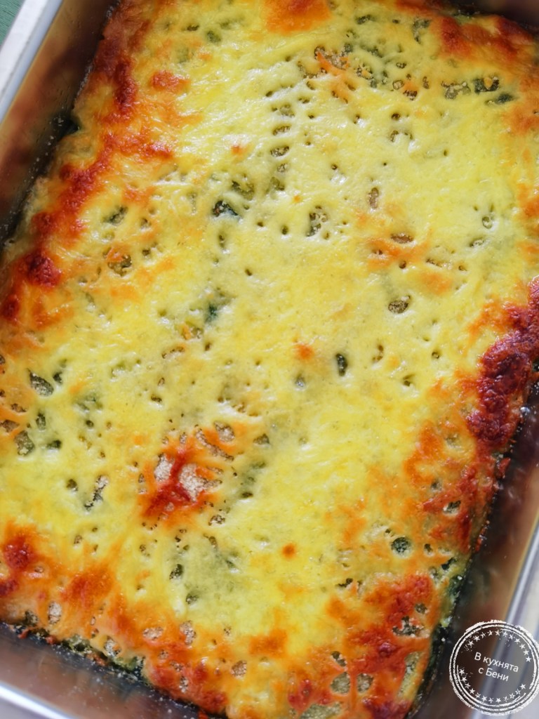 Сложих ястието да се пече в напълно загрята на 180 градуса фурна за около 25 минути или до апетитен загар. Готовото ястие оставих леко да се охлади, за да се режат сравнително хубави като форма парчета. Сервирах с кисело мляко.