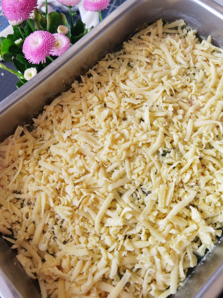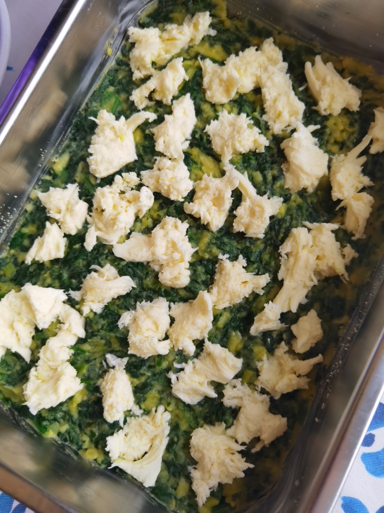 Дъното и стените на средно голяма тава с размер 25х18х6,5 см. намазах с масло и поръсих с 2 с.л. от галетата. Изсипах половината от картофено-спаначената смес и я загладих. Топката моцарела накъсах на дребно и разположих парченцата върху сместа. Отгоре разпределих останалата картофено-спаначена смес, загладих, поръсих с останалите 2 с.л. галета и с останалия кашкавал (100 г).