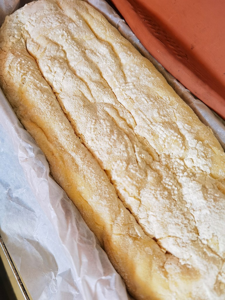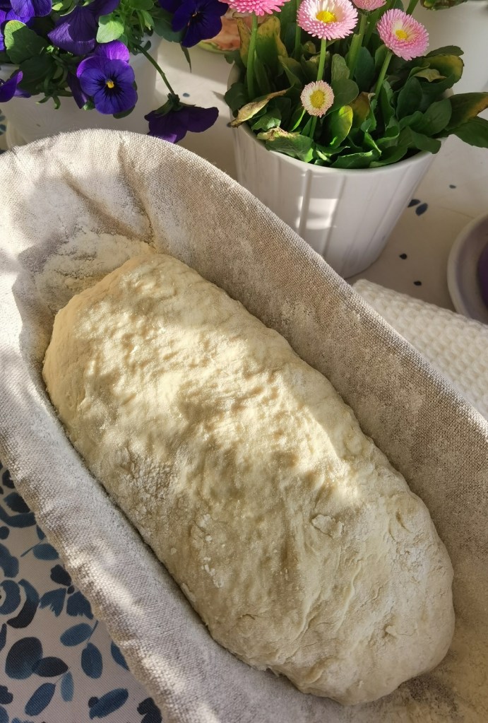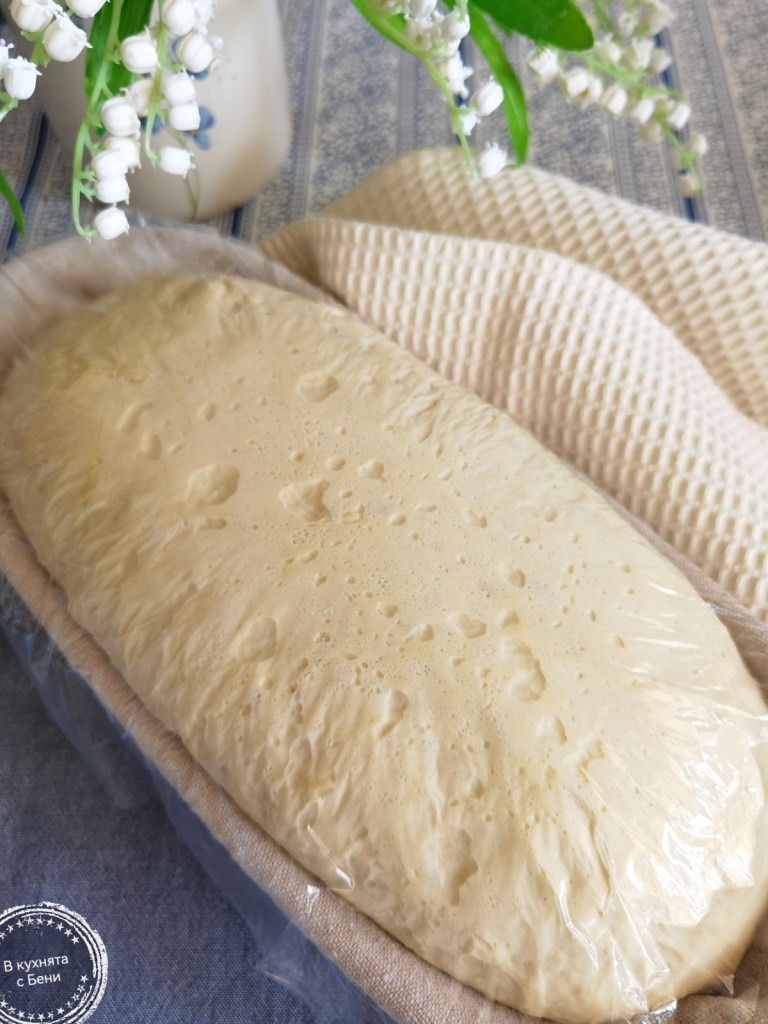 В купа сложих хладката към топла вода, олиото и половината от брашното. Добавих сухата закваска и разбърках с бъркалката за тесто. Прибавих солта, постепенно и останалото брашно и в самата купа замесих и оформих меко и леко лепнещо тесто. Може да е нужно да добавите още не повече от 2 ч.л. брашно, но не повече, за да остане хлябът въздушен. Оформеното тесто сложих в набрашнения панер. Покрих го с фолио за свежо съхранение и с памучна кърпа и оставих да втаса на стайна температура, докато утрои обема си. Днес при мен това отне 2 часа. Важно е да втасва бавно, а не да ускоряваме процеса, като го сложим до топлинен източник!