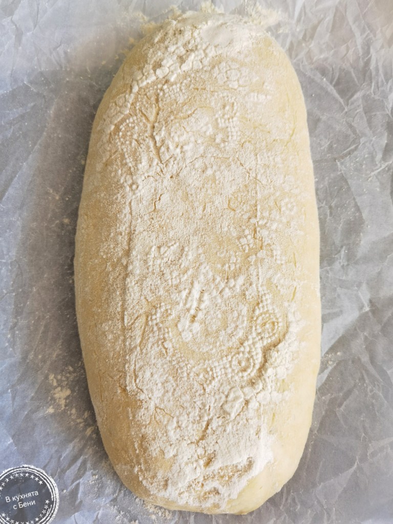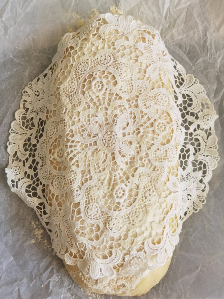 Съда за печене (основата и капака) сложих в студена фурна и я включих на 250 градуса. Тестото обърнах върху набрашнена хартия за печене. Направих украса, като го покрих с плетен текстил, поръсих с брашно и отстраних текстила.
