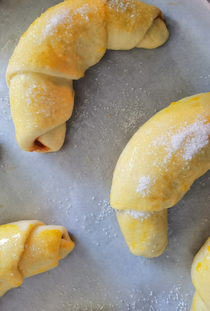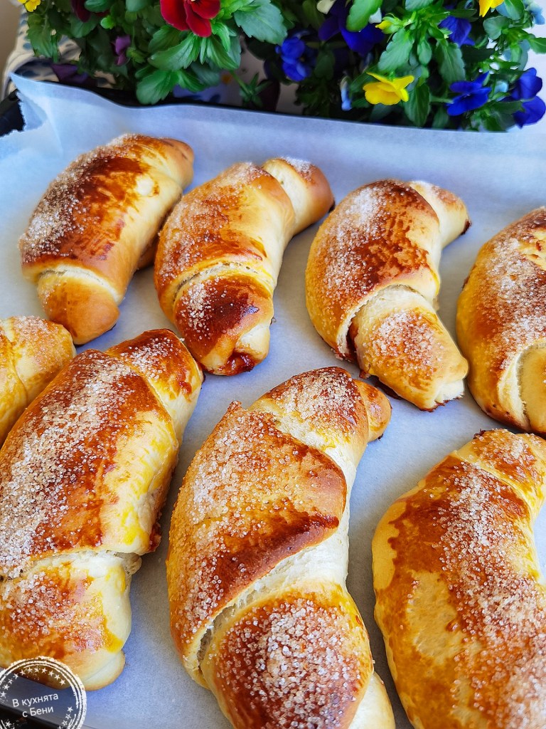 След 30 минути намазах кифлите с жълтъка, който смесих добре с 1 ч.л. прясно мляко и ги поръсих със ситна захар.