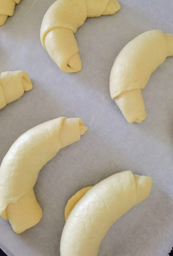 След това внимателно завих и така получената кифла преместих в тавата за печене, която бях покрила с хартия за печене и намазала с мазнина. По този начин приготвих и останалите седем кифли. Покрих ги с фолио за свежо съхранение и оставих за 30 минути да втаса още. Междувременно загрях фурната на 170 градуса.