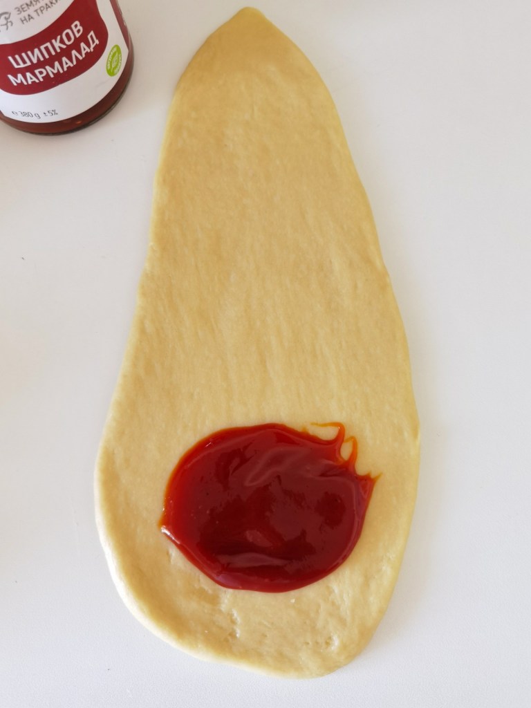 Взех първото и го разточих тънко, като в едната страха бе по-широко, както е видно на снимката. В тази по-широка част сложих 1 и ½ ч.л. мармалад, прехлупих и притиснах краищата, за да се запечата мармалада. Не слагайте твърде много пълнеж!