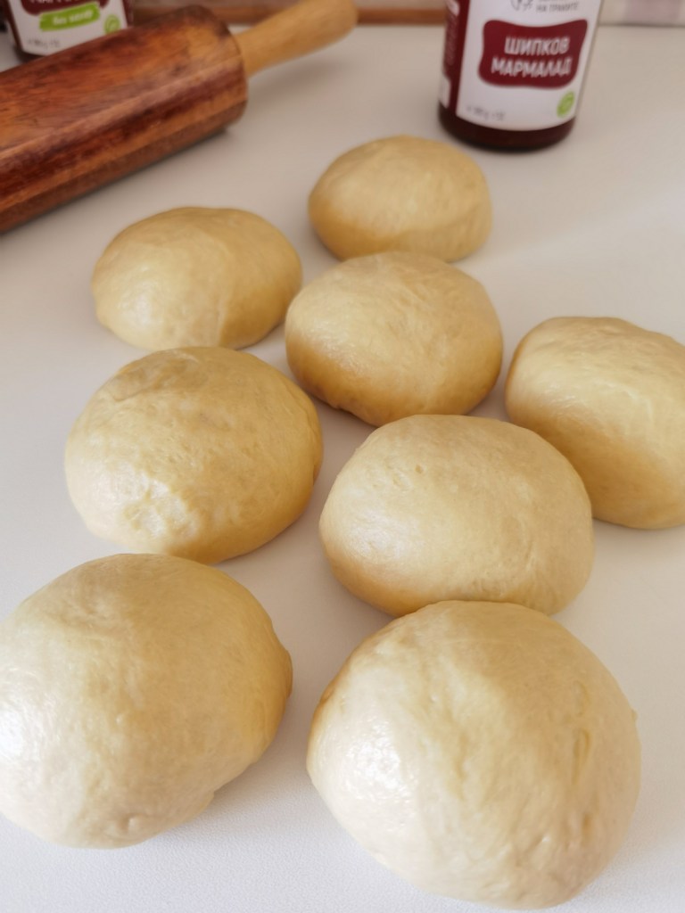 Втасалото тесто леко премесих и разрязах на осем равни парченца. Всяко от тях оформих на топчета с еднакъв грамаж. Измерих тестото и беше 1 кг., като съответно всяко от топчетата беше с тегло 125 г.