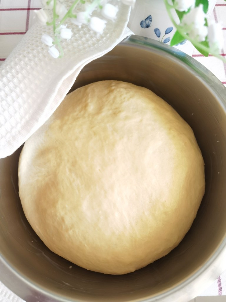 Купата намазах леко с масло и сложих тестото, като го обърнах веднъж, за да се намазни и от другата страна. Покрих я с фолио за свежо съхранение и с кърпа и оставих тестото да втаса и утрои обема си, което отне 2 часа. Ако в помещението е топло, може да е нужно и по-малко време. Тук също е важно да не превтасва тестото! Не съм го слагала на специално топло място, а на стайна температура.