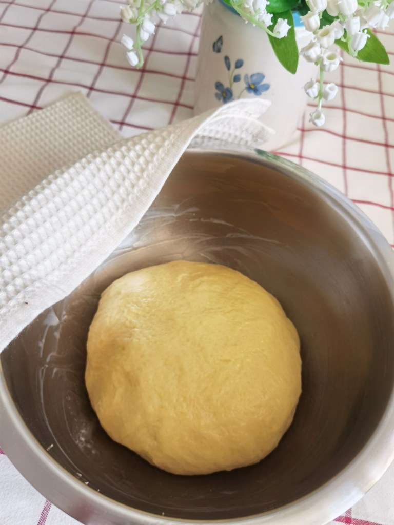 Млякото загрях до степен да се затопли леко, а не да е горещо и сложих маята, 1 ч.л. от предвидената захар и 2 с.л. от предвиденото брашно. Разбърках, покрих с кърпа и оставих на топло за около 10-15 минути или докато се разтвори и шупна. Това е важен момент за успеха на рецептата. Не трябва да превтаса! Маслото разтопих в метално канче, добавих олиото и оставих леко да се охладят. Брашното пресях. В купа сложих яйцето, захарта, ваниловата и лимоновата захар и ги разбърках с кухненска бъркалка за минута. Добавих добре шупналата мая и топлото масло, като запазих 1 ч.л. от него. Разбърках и постепенно добавих около 450 грама от предвиденото брашно, като замесих меко тесто в самата купа. Всяко брашно поема по различен начин течните съставки и затова, ако тестото е много лепкаво, добавяйте по още малко брашно, докато получите нелепнещо, но много меко тесто. Прехвърлих го върху намазнен плот и доомесих за 3-4 минути, като разтягах и усуквах тестото. Тук е особено важният момент да не се изкушите да добавяте повече от нужното количество брашно. Може само още малко. Тестото трябва да бъде меко!