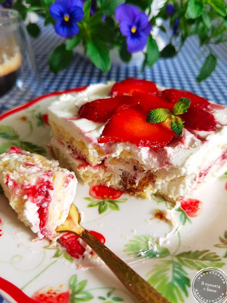 Сервирах парченцата, украсени с резенчета свежи ягоди, които, за да имат гланциран вид, намазах с малко кайсиев конфитюр.