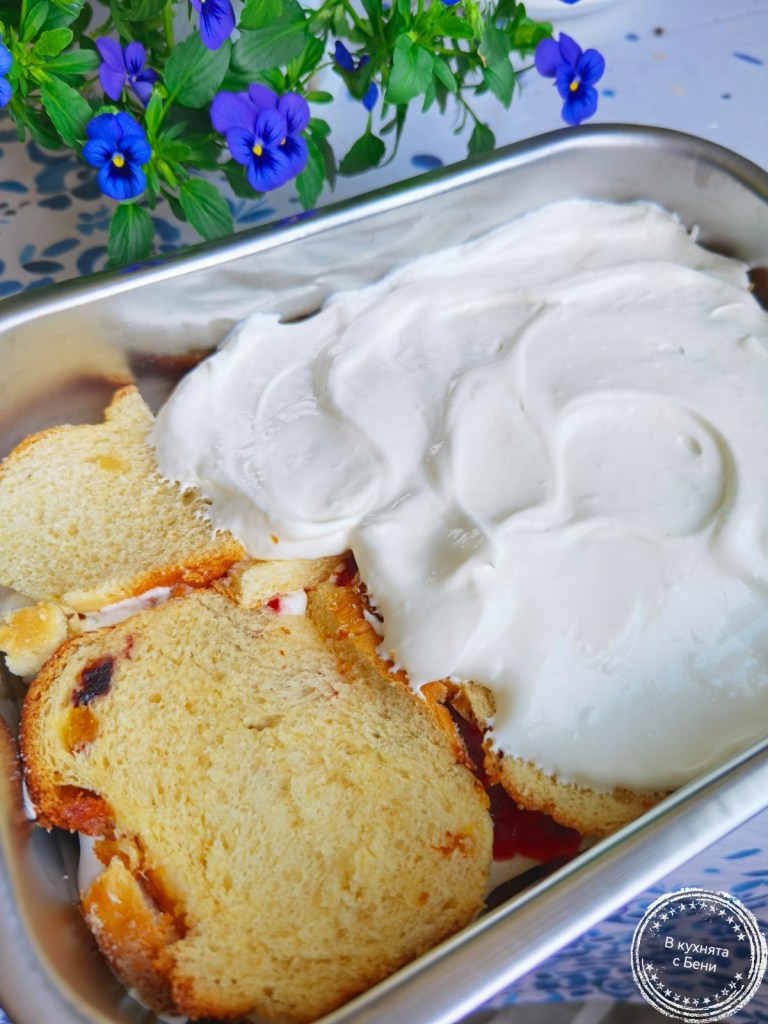 Козунакът нарязах на парченца с дебелина 1 см. Не трябва да са по-дебели. На дъното на тавичката подредих плътен слой от половината парченца, като изрязах някои така, че да паснат добре. Леко ги сиропирах с прясно мляко, като използвах четка, за да не прекаля с количеството. Ако козунакът е по-сух, ще е нужно малко повече сиропиране, а ако е много мек, може и изобщо да се пропусне този момент. Вместо прясно мляко може да използвате захарен сироп или компот. Отгоре разпределих половината сметанов крем и на места сложих ягодовото сладко. Отгоре подредих втория слой козуначени парченца, които също сиропирах леко и намазах с останалия крем.