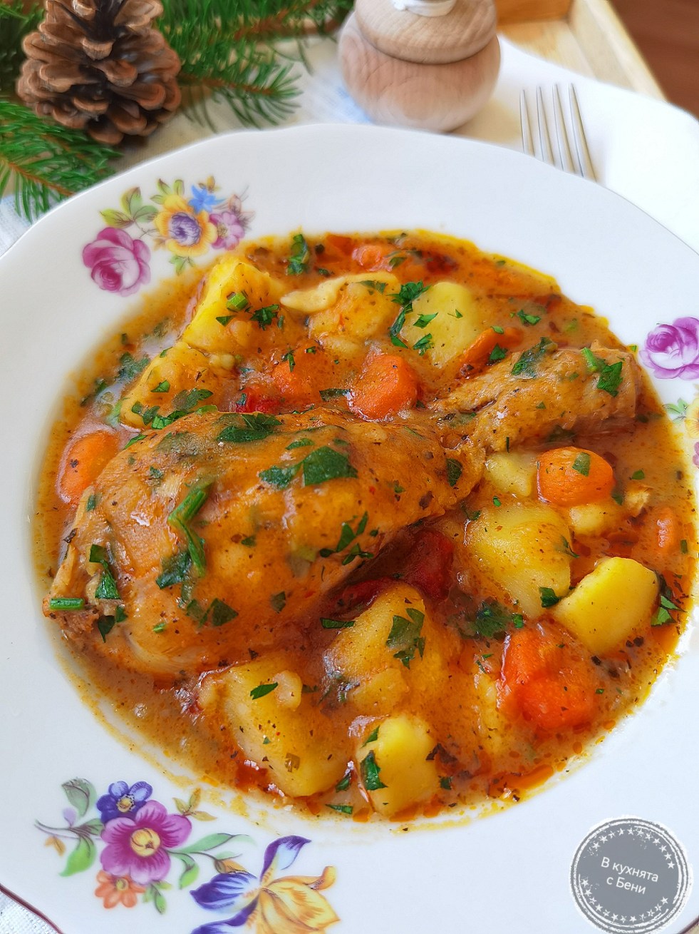 Здравейте, приятели! 🤗Първата рецепта за новата година е семпла, обикновена и много вкусна. 😋🍲🍴☺️Яхния с пиле и картофи приготвих за обяд днес и си хапнахме чудесно. Такъв тип манджи са ни любими и някак внасят уют на трапезата.☺️🍽Пожелавам ви успешен старт на годината, много усмивки и добро настроение!🥰🎉Нужни са:🍲700 г пилешко месо (използвах бутчета и… Продължете да четете Яхния с пиле и картофи